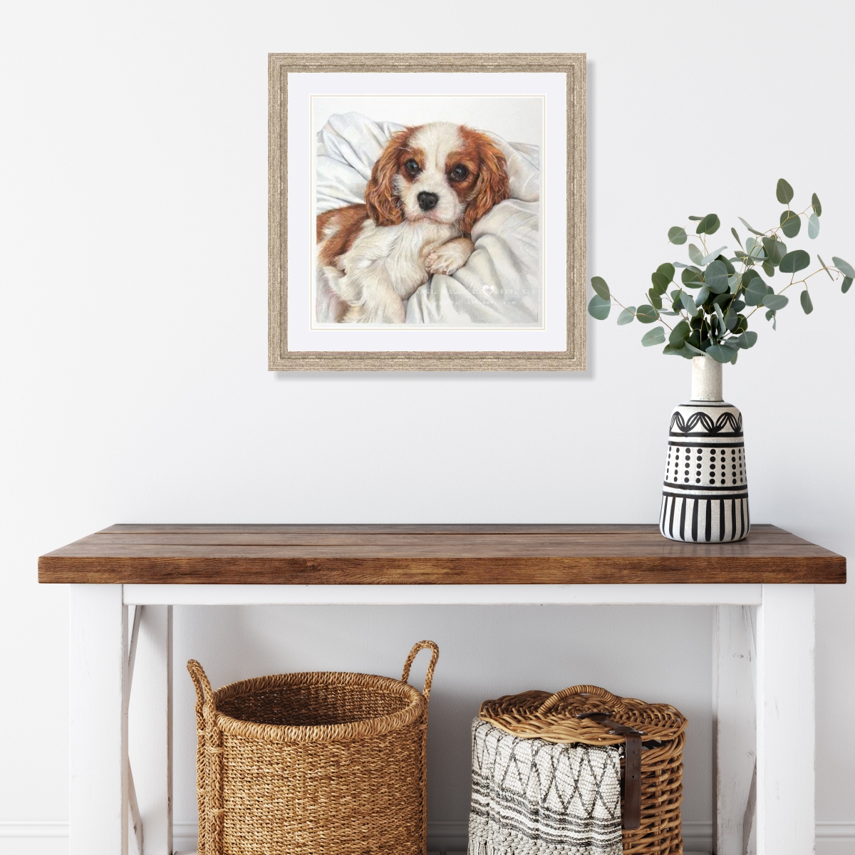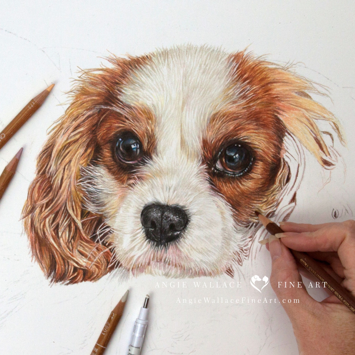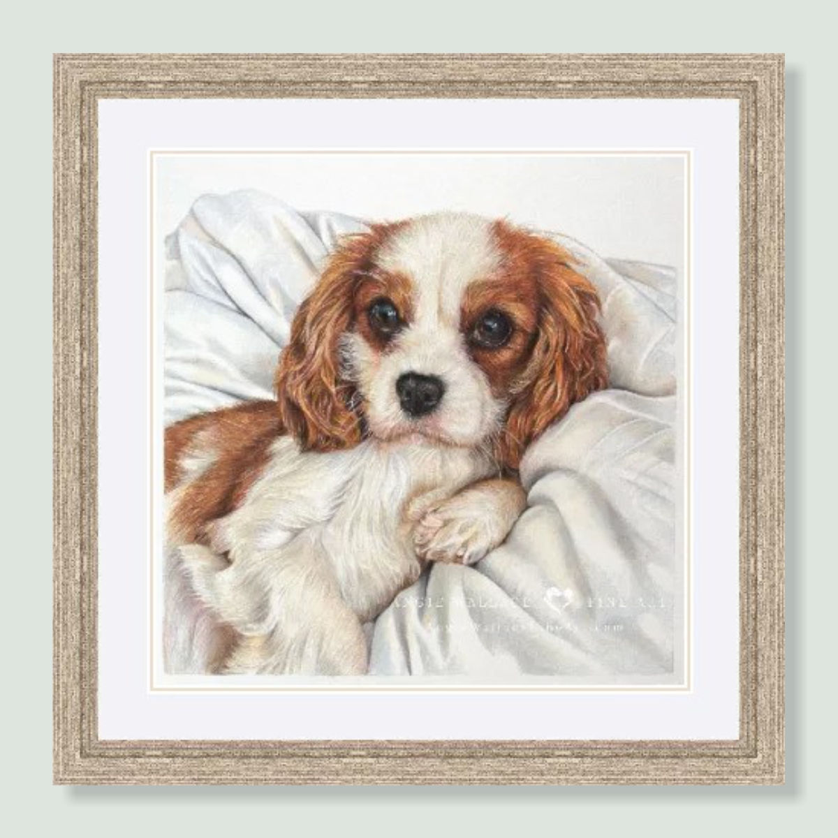Here’s Cooper’s the Cavalier’s finished portrait. His owners wanted me to capture his playfulness and youthfulness. Here he is snuggled on the bed, looking adorable.