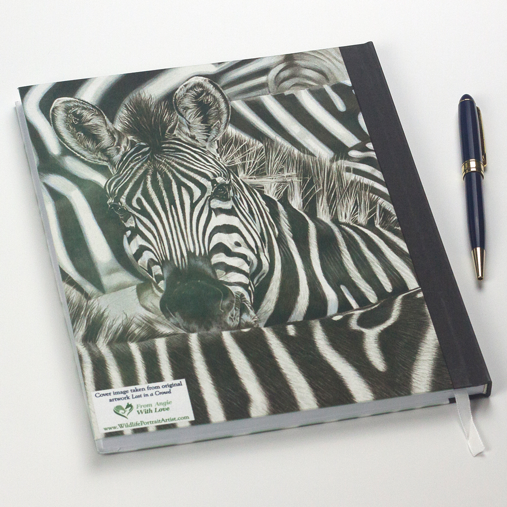 This premium quality wildlife art notebook features an image taken from my Zebra portrait Lost in a Crowd, and offers 192 lined pages (96 sheets) bound into a hard cover with a silk-feel fabric finish which is printed on the front and back and includes a ribbon bookmark – perfect for all your most important notes, ideas, to do lists, or visitor comments. Measures 25x20cm.